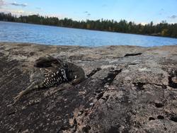 Proceeding south we catch a few walleyes in the narrow areas with current. Then pass by table-rock and the pictographs. Once at the pictographs, its apparent the wind is starting to pick up and we are getting a bit tired. We see the campsite closest to the falls was open so we made it our home for the night. We walked around away from both campsites staying on higher ground and harvested a another grouse. Slept well and got up early to travel up the horse river and out. The horse was very low. In addition to the mapped portages I think we had at least 3 more. We did have a nice north wind push us down Horse Lake. We met two guys at the Tin Can Mike portage and chatted a bit giving them a heads up about the extra portages ahead as well as our fishing report and wished them safe travels.