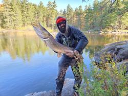 We made our way along the east shore and stopped to get out and walk around the campsite at Big Current. I like this site. We press north to the current area and Austin hammers a walleye or three then a big pike hits his jig....fights on! I paddled to the shore and we landed the critter. A quick measurement and some photos then released. What a beautiful fish in a such a cool spot.