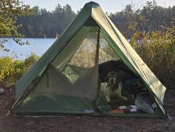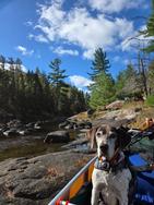 The lake is absolute glass and the paddling was easy. Really enjoying the morning so far. We round the bend to the Boot Lake portage seeing and saying hello to a group of guys camping at the campsite on the this point. We make it to the portage and meet a group of women finishing up their portage. They asked if they can pet Cash...the old dog loved the attention. We get done with this easy portage and continue up Boot Lake. The weather is great and we make good time getting into Fairy. The campsite near the north portage was occupied with a guy making breakfast. He didn't have any coffee on but said he could make some:) We said thanks but continued on to Gun. We passed by a couple fishing and made our way to the campsite south of the narrows for a break. After filtering water and snacking we get going to the big portage for the day. Having been on this route in 2023 I remembered this portage as not hard just a bit long. I take the tackle pack and the Seneca and start. I make it to Wagosh and take a quick drink then make my way back for the second trip. On my second trip to Wagosh I hear Grouse drumming in the distance and make Austin aware when we meet but hes heard them too.