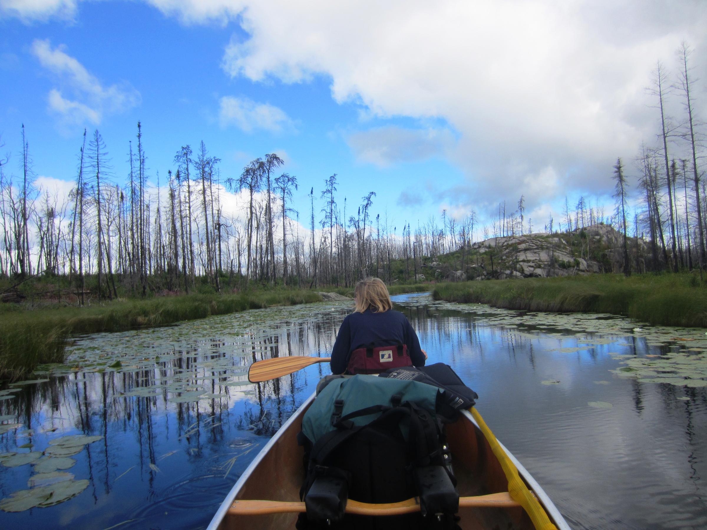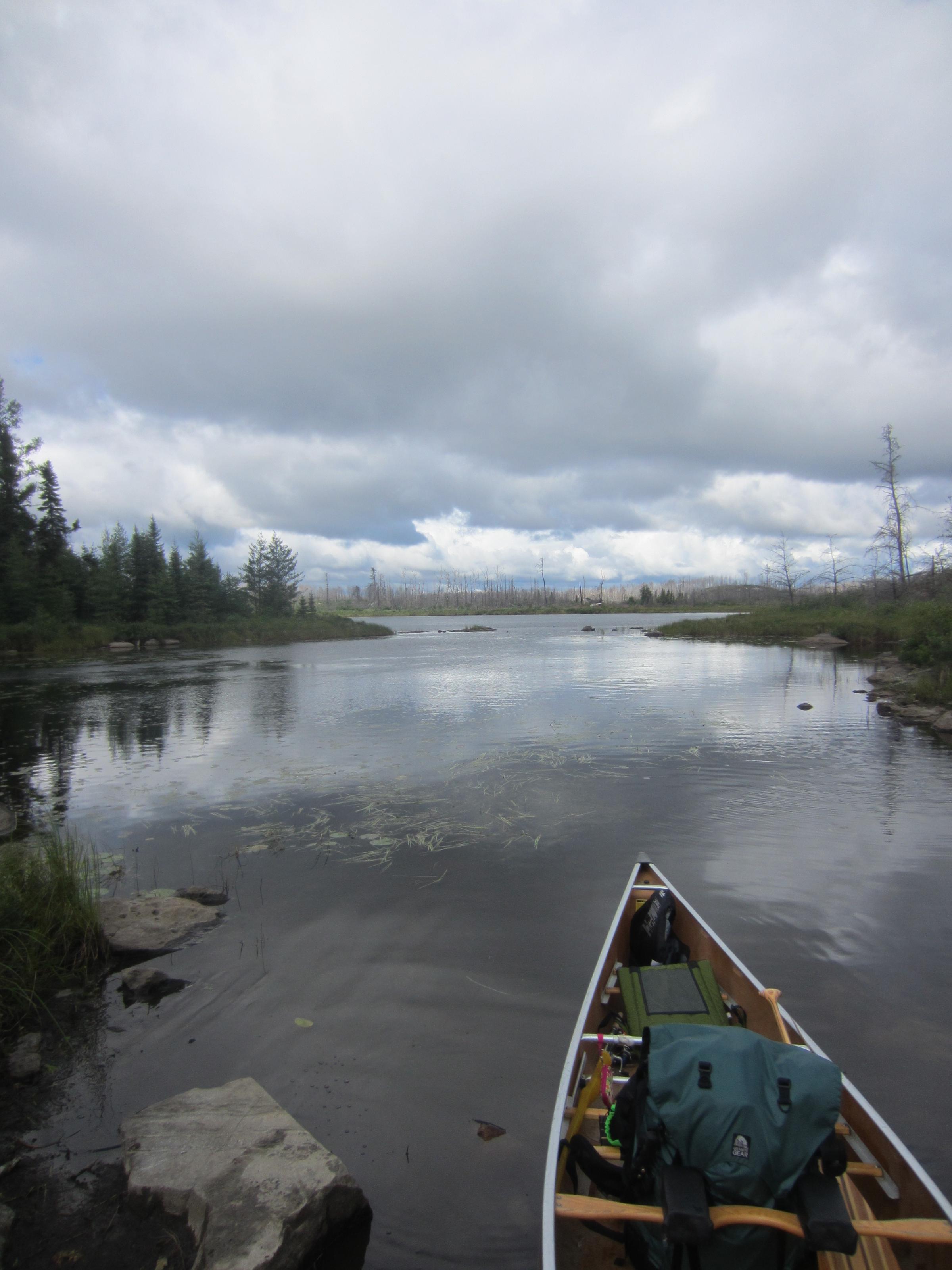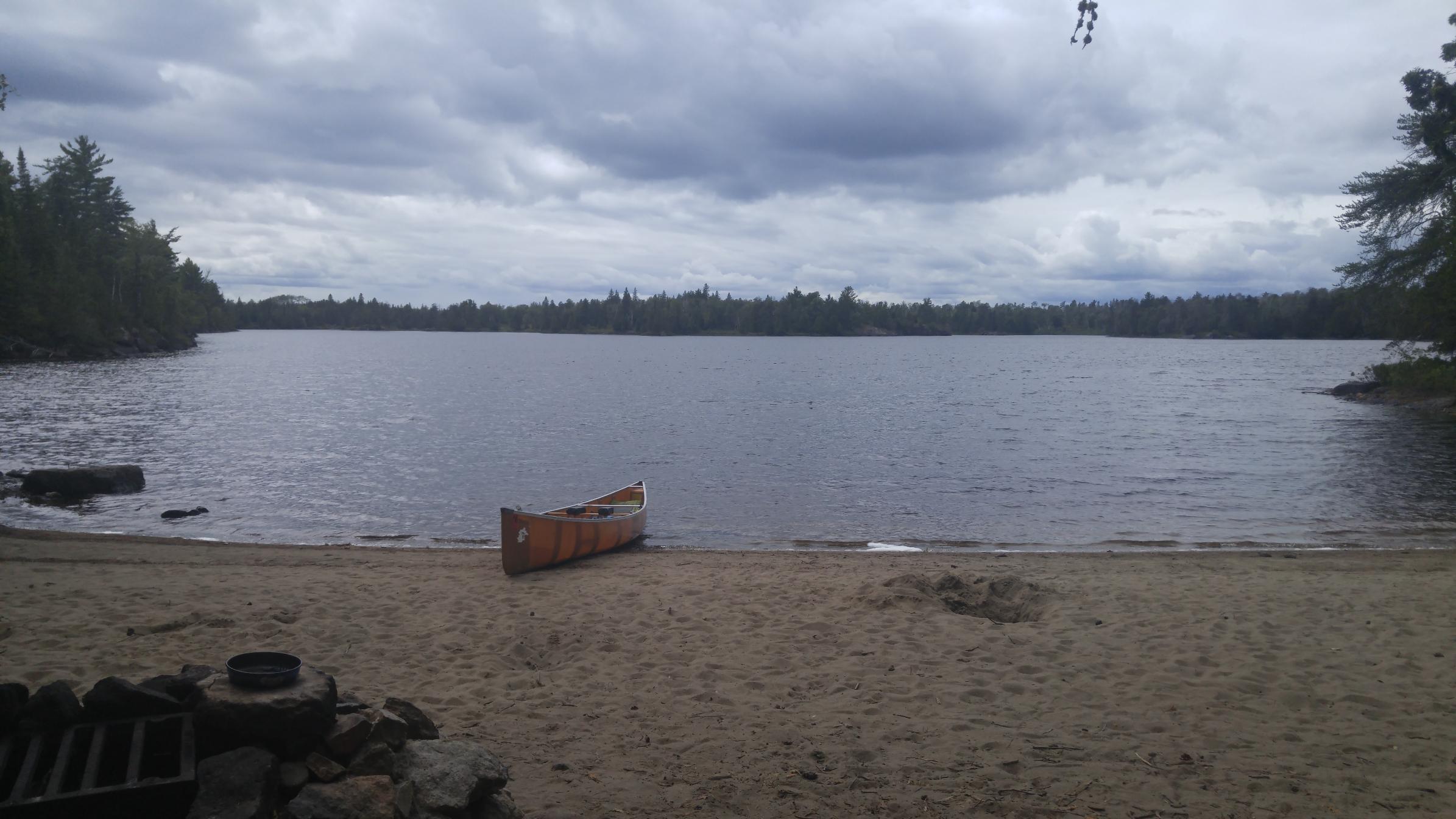 We left Temperance River campground at 6:30. We stopped at holiday for breakfast and coffee since we did not want to waste time cooking and because we forgot the eggs to make french toast with. We also broke our eggs for in the BWCA so we bought dozen and took 3 eggs and gave the other 9 to the cashier. We had an hour drive to the Kawishiwi Lake and we were on the water at 9ish. The first lake was windy and our canoe was not weighted great with a light front end and we did get spun in the wind onetime. The river was much calmer and we could shift some weight closer to the front. When we got to Square Lake we could see the burn and blow down area. We met a group of 6 guys coming out at the portage going to Polly and a mom, dad, and 9ish year old boy going in, from Michigan. Their goal was Malberg as well. On the portage after square we found raspberries and blueberries which were ripe. We were excited to pick a few for a snack and hoped for some by our site for our pancakes. We had a 0.6 mile and 0.4 mile portages to Polly. There was also a group of 4 happy young girls, maybe 8 years old with 4 dads in there 30s coming out. When portaging we saw a group of 3 canoes behind us which seemed to be pushing for Malberg. We kicked it down a bit across Polly and continued to single portage everything to keep in front of the other groups. We ate a quick egg salad sandwich on koma and trails mix. I chipped my tooth on a carmel in our mix. We got to Malberg and sites didn't seem like they would be a problem sites 1054, 1055, and 1056 were all open. The narrows (1053) was taken by a couple of guys. They were leaving tomorrow but they did say the group on the sand site (1051) left this morning and they thought it was still open. We headed there and made camp at one hell of a nice site (5stars). Not great fishing but great sand beach cooking area and spot for 4 tents. We set up camp in a hurry with feeling a few sprinkles. We ate a snack and collected firewood. At 5ish we decided to lay down for an hour nap. We had pizzas over the fire for supper. Nikki dropped one pizza in the fire. We decided to go and get water and troll for a bit. We saw a 1 year old black bear by the water in the narrows right when I hooked the first walleye. We went to the deeper narrows to see depth and talked to a group who pulled in at 3ish. On the way back Nikki had a nice bite but missed it and I had a little northern. We went back to camp had a fire and read a bit and fished from shore with no luck. Temp was low 60s with wind 10 to 15 mph from the north, gusts at times 20mph. It was cloudy with a few times some blue sky peaking out. Sunset was cloudy but still nice. We had a great day with no fighting.