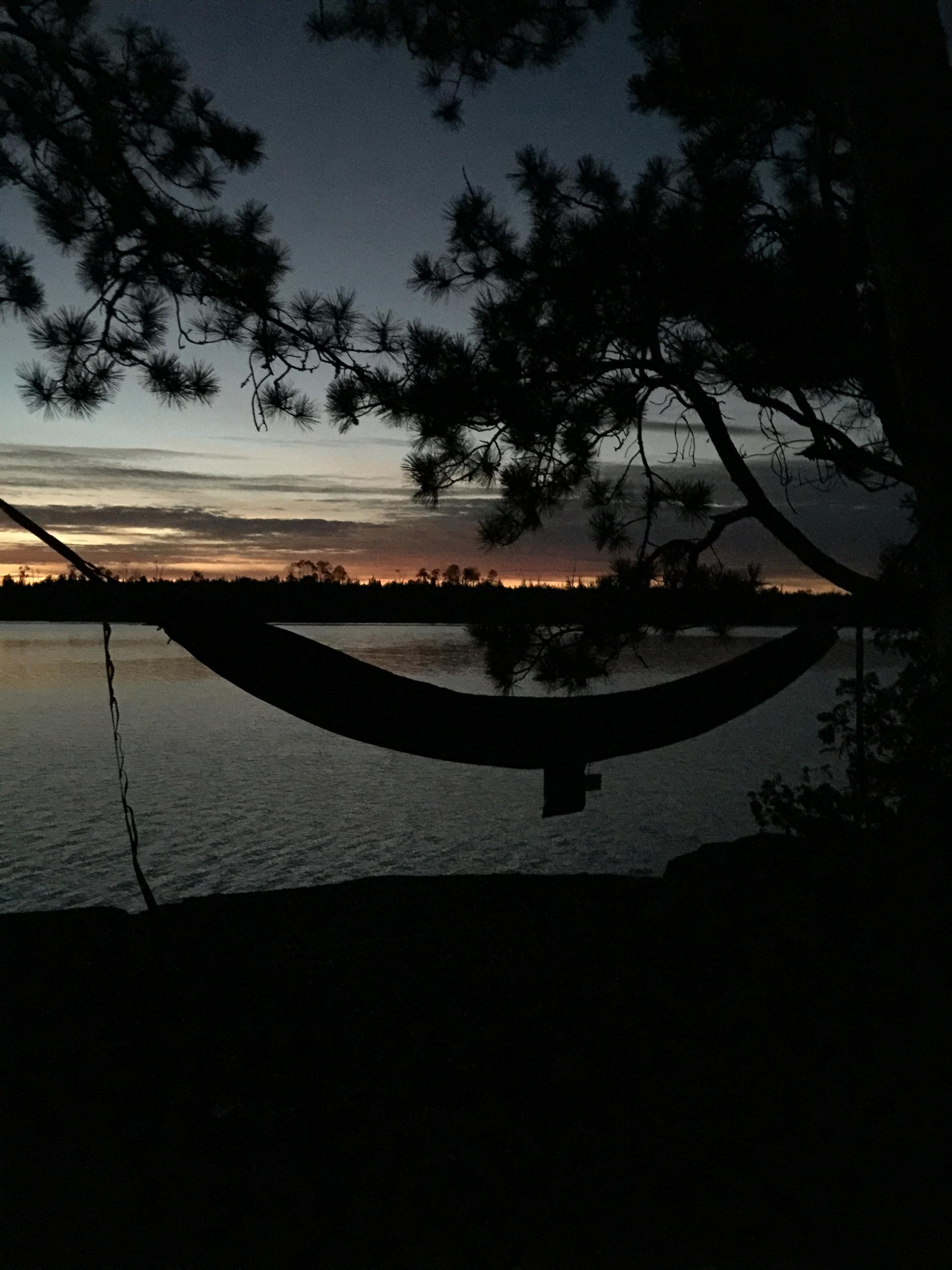 Saturday, September 12, 2015 Today we decided to take it easy and relax. We slept in until 7:30 despite the camp squirrels and chipmunks becoming more aggressive throughout the night. They started getting closer and closer to the tent during the night. When we woke up it was really foggy out and we had a nice time watching the fog lift from the lake. After the fog cleared the lake became like glass. It was a beautiful morning. We headed out to tour the bay we were camped in. I caught a nice northern and decided to keep it so we could have our potato fish chowder the following night. We had a fun time exploring the bay and found some cool shallow areas at the back of the bay. We then headed back to camp and set up the hammocks. I took a nap while my wife read her book. After the nap we went back to the island across from us and gathered some more fire wood. Dinner was not to our liking (we were spoiled from the night before) and we ended up having peanut butter and cheese ups. Don't hate on them, they were good. We left a nice bunch of fire wood for the next people who stay at this camp site. The sunset was amazing this night!