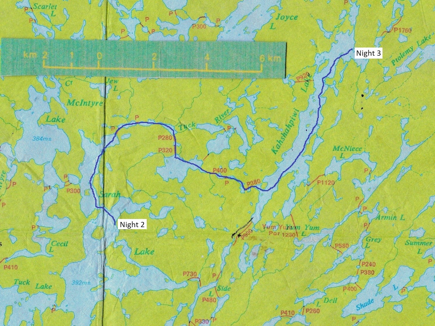 Day 3, August 29, 2023. Through the Burn. 10.7 miles, 7 portages. Sarah, 6 no-names, and Kahshahpiwi Lakes.