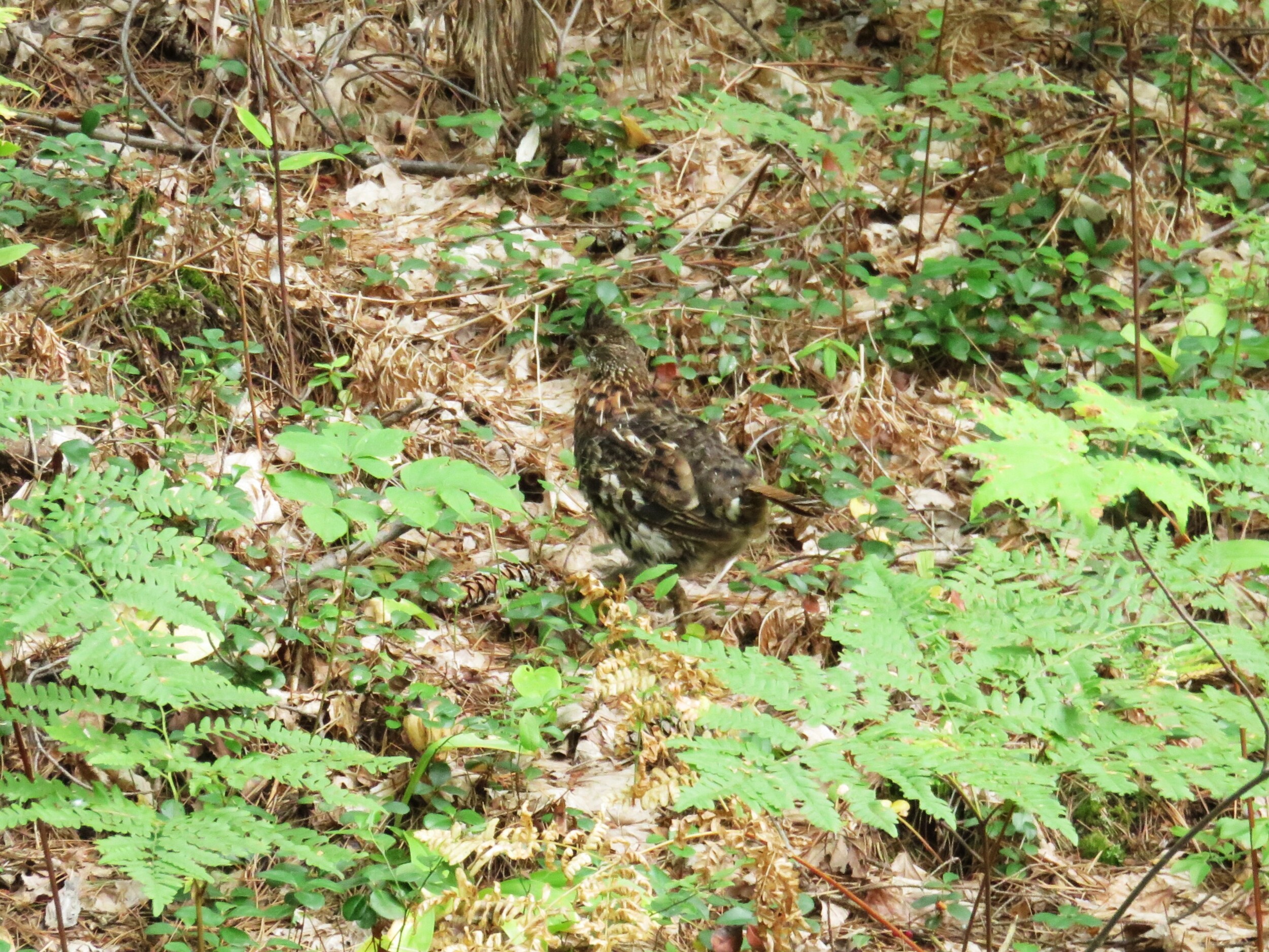 Today was a long day (and our planned route was a bit longer). We left our Sarah campsite around 8:00 and paddled through Sarah's 'waist', where the 2021 fire appeared to have transitioned from a canopy fire to an understory fire. The campsite at that narrow section of Sarah is one of our favorites, but doesn't appear to have been camped a lot this year, and while the canopy isn't impacted much around the campsite, the once-thick understory growth has been greatly reduced. Our portage out of Sarah's northeast corner was very different than when we last traveled through here. The fire was so intense here that the highly organic soil burned from between the rocks along the portage trail, turning the path into a rock-hop that we could only identify by the surveyor's tape a portage crew had used to denote the trail. It'll take several years' leaf litter to refill the gaps between the rocks. As we exited the portage, Tia saw a couple grouse. The second no-name had a floating muskeg put-in, and the lake's perimeter was mostly sphagnum moss and other water-loving plants. At the end of the next portage we spotted a family of six grouse, and I was able to grab a couple photos. We had light breezes as we worked our way through the no-name chain, but the wind was pretty high when we entered Kahshahpiwi. We paddled to the east shore and found a nice lunch stop around 1:00. Wind picked up as we lunched, and we saw occasional whitecaps as we paddled north and into the wind on the lake. We paddled past 'the Hilton' campsite, then turned into Kahshahpiwi's eastern bay holding the portage into Trant. It was around 3:00 when we reached the bay, so rather than head for Trant, our route plan for night 3, we stayed on a nice island campsite we'd used several trips back in that bay. Campsite setup was easy, and Tia caught up her journal notes as I did the bear bag hang. We had afternoon coffee/tea, and Tia finally had an opportunity to review her 'Plants of the Canoe Country' flower book. Wind died around 5:00, and we were fed and in bed by 8:00.